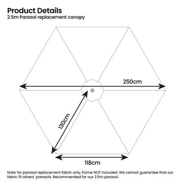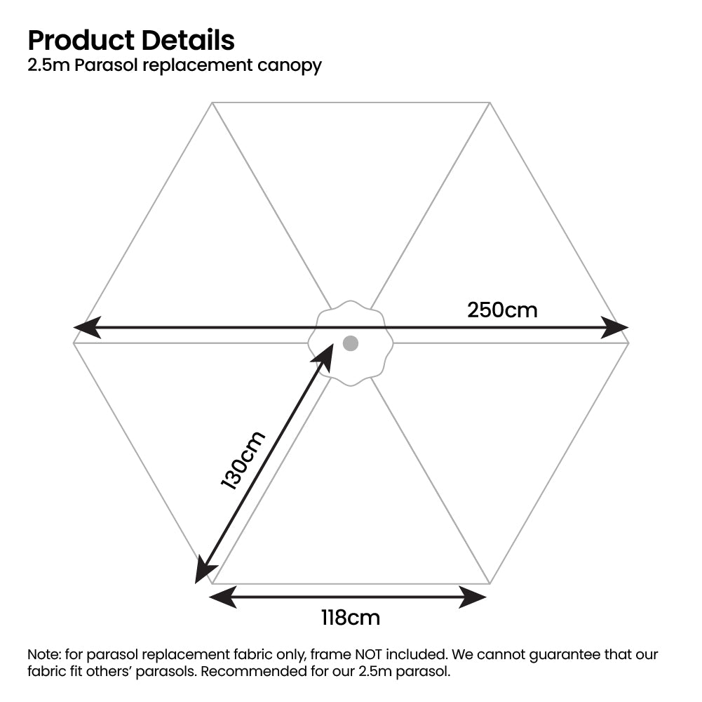 Note: Product includes replacement parasol fabric ONLY, frame is NOT included. Recommended for our 2.5m parasol. We cannot guarantee that our fabric fits other parasol frames.